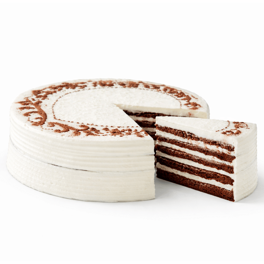 Тонкие, воздушные, шоколадные коржи с прослойкой сливочно-бананового крема. Срок годности до 3-х дней со дня производства