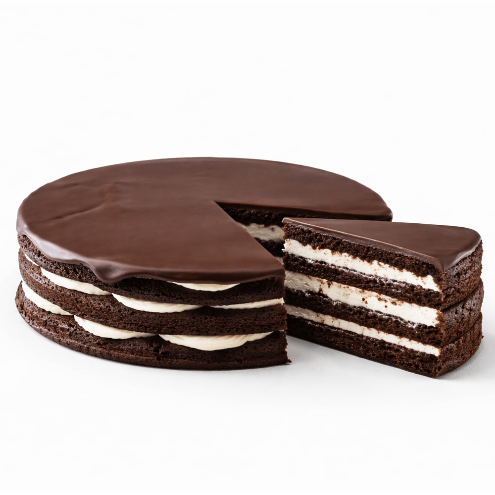 Насыщенный шоколадный бисквит с добавлением бельгийского шоколада и нежный сырно-сливочный крем.