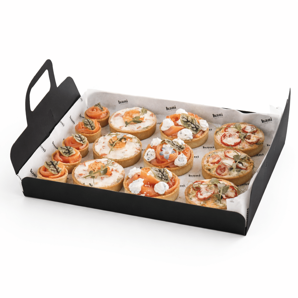 Предзаказ. В бокс входит: Мини тарталетка с сёмгой и творожным кремом, Мини киш с креветками, шпинатом и перцем, Тарталетка с риетом с сёмгой и икрой, Мини киш с сёмгой и брокколи.