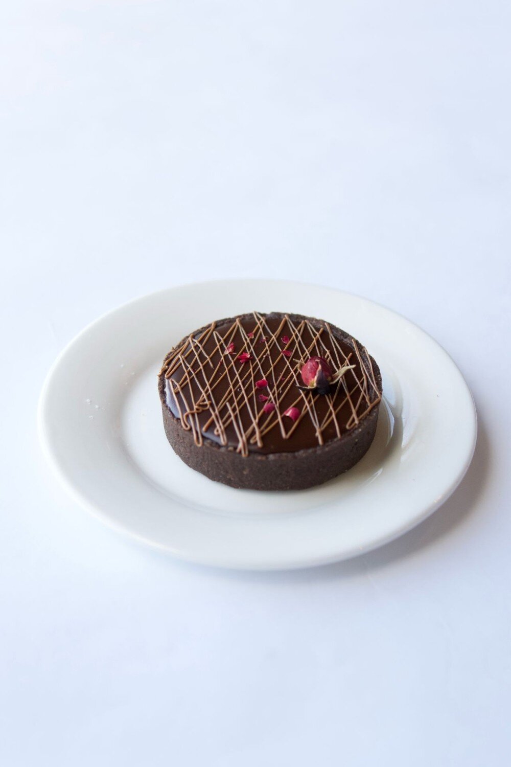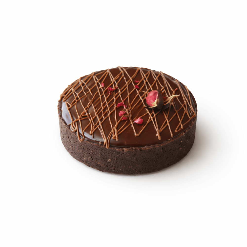 Шоколадное, песочное сабле, соленая карамель с молочным шоколадом и нежный ганаш на основе бельгийского тёмного шоколада Callebaut, цельные орешки обжаренного миндаля