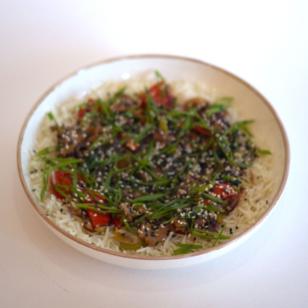Ароматная говядина по-монгольский в пряном соусе, сервированная рисом/стеклянной лапшой (на выбор), шпинат, чеснок, красный лук, сельдерей, перец болгарский, черри