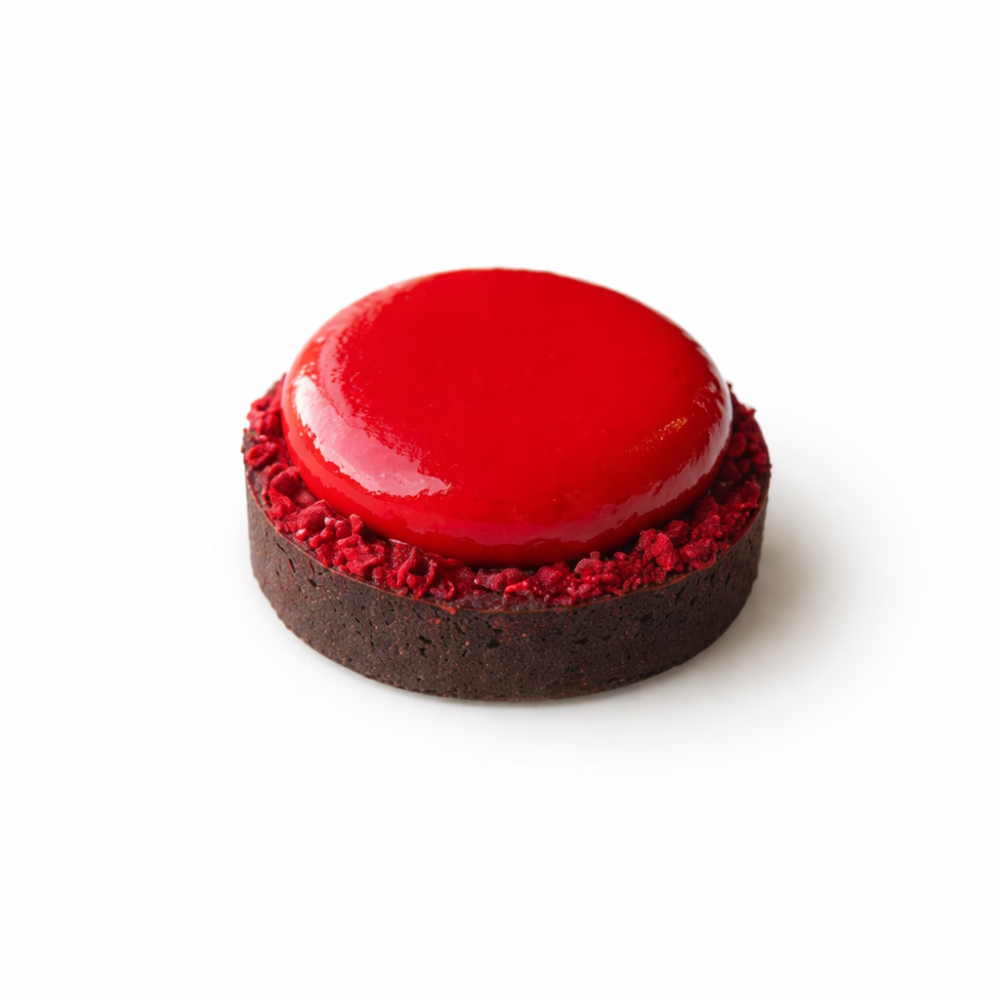 Тонкое шоколадное сабле, малиновое кремю, малиновое суфле и зеркальная глазурь