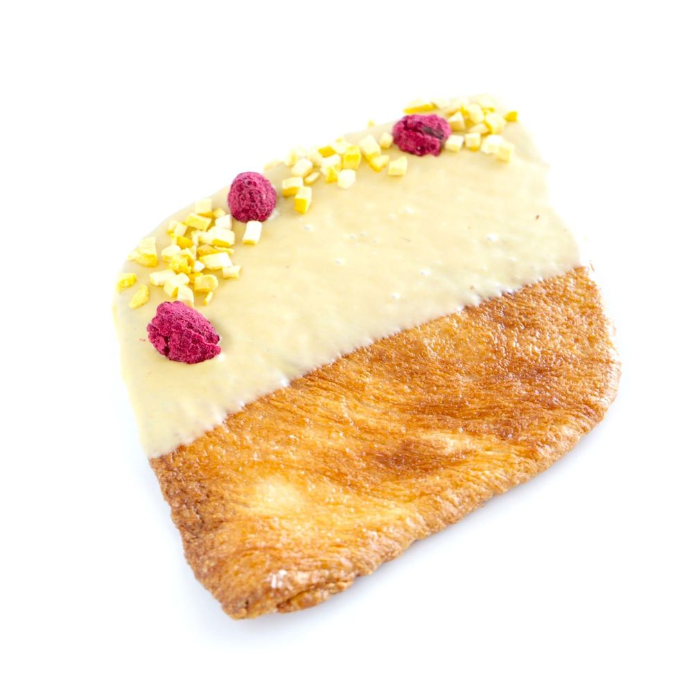 Тесто на основе натурального, сливочного масла, сделанное по французской технологии, украшен Бельгийским шоколадом Callebaut и сублимированным манго и малиной